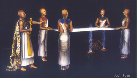 Finally, I wish to leave the reader with an illustration of the ‘Sonic Rebirth Ritual’ envisioned with the help of the talented artist Judith Page. In this hypothetical ritual the sarcophagus contains the pharaoh Cheops (either living or dead). The four priests, standing at each corner, gently rest their fingertips on the granite edge in order to sense the resonant frequency. The priests generate powerful vowel intonations, gradually shifting the pitch until maximum acoustic excitation occurs. At this point, two of the priests maintain this frequency whilst the other two drop their pitch by a small margin, thus creating dramatic beat frequencies. Meanwhile the Sem priest, robed in a beautiful leopard skin, continually recites magical spells and confers these upon the pharaoh by holding his left hand over the sarcophagus. Cheops’ ka travels to the stars, via the star shafts, and returns to be reborn, illustrated by the image of a fetus.