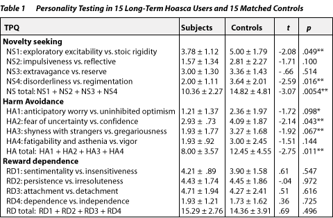 The TPQ measuring the three domains of novelty seeking, harm avoidance, and reward dependence, was administered to the 15 experimental long-term hoasca-drinking subjects and to the 15 hoasca-na’ve control subjects. Means and standard deviations and results of t-test comparisons are shown in (Table 1). Significant findings on the novelty seeking domain included UDV subjects having greater stoic rigidity versus exploratory excitability (p < .049) and greater regimentation versus disorderliness (p < .016). A trend toward group difference was found along the spectrum of greater reflection versus impulsivity (p < .1). No group differences were found along the spectrum of reserve versus extravagance (p < .514). Summation of all four spectrums of the novelty seeking domain identified a highly significant difference between the two groups (p< .0054).