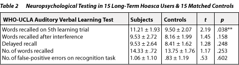 A similar problem arises with the interpretation of the neuropsychological data. Although long-term UDV hoasca-imbibing subjects scored significantly higher on neuropsychological testing compared with their hoasca-naïve controls, as measured on the WHO-UCLA Auditory Learning Verbal Memory Test, the lack of retrospective data makes it impossible to determine whether the hoasca ‘tea’ has had a cognitive enhancing effect or not. Although our UDV subjects spoke at length of how the hoasca had improved their powers of memory and concentration, the current methodology was not designed to definitively substantiate this connection. Only with comparative evaluation to neuropsychological performance prior to their very first experience with hoasca consumption can a comprehensive understanding of the long-term effects of hoasca on cognitive status be established. Also, only by administering such measures on naïve subjects, and then following them prospectively over time with serial evaluations as they became involved with the UDV ad ritual use of hoasca, can we definitively ascertain whether the hoasca does indeed improve cognitive status. The methodological approach utilized for the present study was only intended to be preliminary and exploratory, and did not possess the necessary logistics, which would have allowed for such a prospective study. Indications are, however, that given the presented data analyses, the long-term consumption of hoasca within the structured UDV ceremonial setting does not appear to exert a deleterious effect on neuropsychological function.