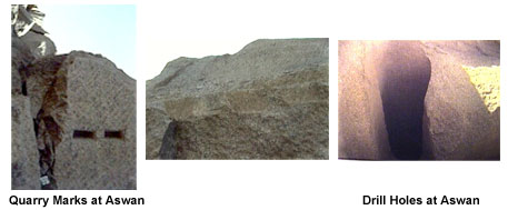 Dutifully, I bought the tickets and arrived at Aswan the next day. After learning some of the Egyptian customs, I got the impression that this was not the first time that my Egyptologist friend had made that trip to the travel agent. The quarry marks I saw there did not satisfy me that the methods described were the only means by which the pyramid builders quarried their rock. There is a large round hole drilled into the bedrock hillside, that measures approximately 12 inches in diameter and 3 feet deep that is located in the channel, which runs the length of the estimated 3,000 ton obelisk,. The hole was drilled at an angle with the top intruding into the channel space. The ancients may have used drills to remove material from the perimeter of the obelisk, knocked out the webs between the holes, and then removed the cusps.