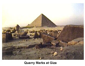 The Aswan quarries were educational, though after returning to Cairo the following day and while strolling around the Giza Plateau later in the week, I started to question the quarry marks at Aswan even more. South of the second pyramid I found an abundance of quarry marks of similar nature. The granite casing stones that had sheathed the second pyramid were stripped off and lying around the base in various stages of destruction. Some of the stones were still in place, though sections had been split away from them, and there I found the same quarry marks that I had seen earlier in the week at Aswan. This was puzzling to me. Disregarding the impossibility of Egyptologists’ theories on the ancient pyramid builders’ quarrying methods, are they really valid even from a non-technical, logical viewpoint? If these quarry marks distinctively identify the people who created the pyramids, why would they engage in such a tremendous amount of extremely difficult work only to destroy their work after having completed it? It seems to me that the quarry marks found at Aswan and on the Giza Plateau were from a later period of time, and they were created by people who were interested only in obtaining granite without caring about the source from where it came.