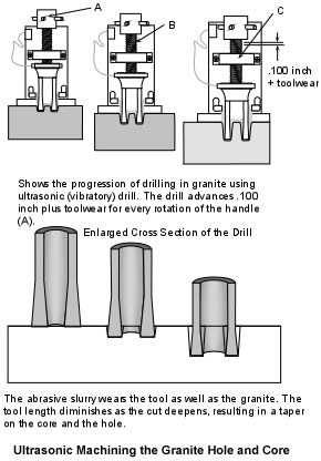 With ultrasonic machining, the tool can plunge straight down into the workpiece. It can also be screwed into the workpiece. The spiral groove can be explained if we consider one of the methods that is predominantly used to uniformly advance machine components. The rotational speed of the drill is not factor in this cutting method. The rotation of the drill is merely a means to advance the drill into the workpiece. Using a screw and nut method the tube drill could be efficiently advanced into the workpiece by turning in a clockwise direction. The screw would gradually thread through the nut, forcing the oscillating drill into the granite. It would be the ultrasonically induced motion of the drill that would do the cutting and not the rotation. The latter would only be needed to sustain a cutting action at the workface. By definition, the process is not a drilling process, by conventional standards, but a grinding process in which abrasives are caused to impact the material in such a way that a controlled amount of material is removed.