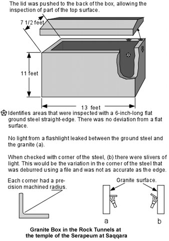 I have contacted four precision granite manufacturers in the US and haven’t been able to find one who can do this kind of work. With Eric Leither of Tru-Stone Corp, I discussed in a letter the technical feasibility of creating several Egyptian artifacts, including the giant granite boxes found in the bedrock tunnels the temple of Serapeum at Saqqarra. He responded as follows: