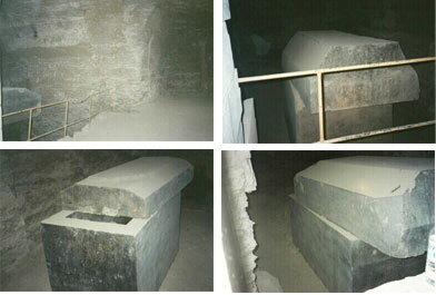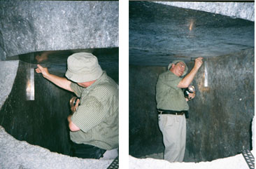 The artifacts I have measure in Egypt have the marks of careful and remarkable manufacturing methods. They are unmistakable and irrefutable in their precision but origin or intent will always be open to speculation. The following series of photographs were taken inside the Serapeum on August 27, 2001. Those taken of me inside one of these huge boxes show me inspecting the squareness between a 27 ton lid and the inside surface of the granite box on which it sits. The precision square I used was calibrated to .00005 inch (that is 5/100,000 of an inch) using a Jones & Lamson comparitor.