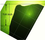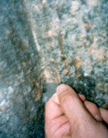 This photograph is of a wax impression taken of the inside southwest vertical corner of Khafre’s box. The wax impression was fixtured on a 40X J&L comparitor. The existence of such a sharp corner raises the question of purpose because of the inordinate amount of extra time needed to work the granite down to such a small dimension.