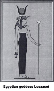 The Egyptian goddess Lusaaset, meaning ‘the great one who comes forth,’ was considered the grandmother of all the Egyptian gods, except for her husband the sun god Tem or Atum (Amun-Ra). Similar in appearance to later goddesses Hathor and Isis, Lusaaset is depicted as wearing the Egyptian vulture crown surmounted with the uraeus (Kundalini cobra) and solar disk between two horns.