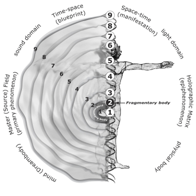 Figure 1: A Foot in Two Worlds. The above figure illustrates the interface between the sound domain of time-space and the light domain of space-time. Note the parallel existence of the bioenergy fields in the former and the chakras in the latter, including the placement of the Fragmentary Body.