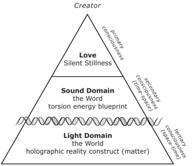 In the threefold process of creation, the Consciousness of Love differentiates first into torsion sound waves, then into torsion light waves. Biblically speaking, the Consciousness of Love is God, who speaks the Word (sound) in order to bring the World (light) into manifestation (Figure 2).