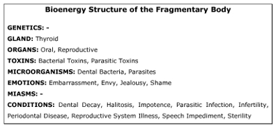 In Figure 3, ignoring the blank categories (—), we see that the microorganisms governed by the Fragmentary Body are dental bacteria and parasites (with associated toxins), while the organ systems are the oral and reproductive, and the gland is the thyroid.
