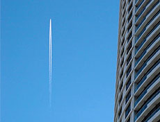According to the U.S. Air Force, jet contrails form above 33,000 feet when hot engine exhaust momentarily condenses ice crystals into pencil-thin vapor trails that quickly vanish like the wake behind a boat.