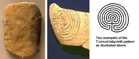 There are two basic labyrinth designs — seven circuit and the eleven circuit. The classical 7-circuit labyrinth pattern is the oldest and most prevalent of the labyrinth designs. The earliest known use of the 7-circuit labyrinth symbol occurs on a clay tablet from the Mycenaean palace at Pylos in Greece. A fire destroyed this palace around 1200 BC, baking the clay tablet and preserving it for archaeologists. It has also been found on pottery from over 2000 years old.