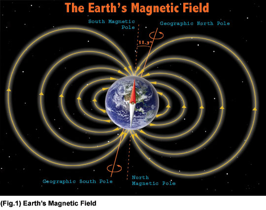 The Earth’s magnetic field is approximately a magnetic dipole, with one pole near the north pole and the other near the geographic south pole. An imaginary line joining the magnetic poles would be inclined by approximately 11.3° from the planet’s axis of rotation. It is often visualized in terms of magnetic field lines, or lines of force, that leave one end, the north pole, arc through space, and re-enter at the other end, the south pole. It is the motions of electrical charges in which magnetic fields are produced.