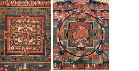 The mandala idea originated long ago before the idea of history itself, in the earliest level of India or even Indo-European religion, in the Rig Veda and its associated literature. Mandala is the term for a chapter, a collection of mantras or verse hymns chanted in Vedic ceremonies, perhaps coming from the sense of round, as in a round of songs. The universe was believed to originate from these hymns, whose sacred sounds contained the genetic patterns of beings and things, so there is already a clear sense of mandala as world-model.