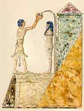 After the death of an Egyptian, the embalmers would bring the body to the ibu, “the pure place”. In this workshop, the body would go through a process that lasted seventy days. The body was purified by washing it with natron water. According to tomb depictions the deceased is shown standing as if alive on a pedestal or in a basin while a number of priests pour the liquid over him. This cleaning ritual was the first step in the process. It is thought to have represented the rebirth of the deceased.