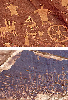 Petroglyphs are images that have been carved, pecked, chipped or abraded into stone. The outer patina covered surface of the parent stone is removed to expose the usually lighter colored stone underneath.