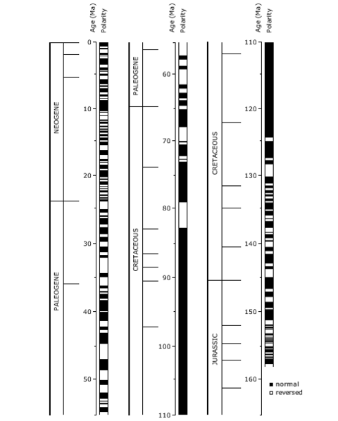 The second would be a reversal of the Earths magnetic poles called geomagnetic reversal in which the positions of magnetic north and magnetic south become interchanged as the Earths magnetic field weakens. A reversal of the magnetic poles is much more likely, as it has occurred several times before in Earth’s history according to paleomagnetists. Evidence for this is provided by measurements of the orientation of magnetic materials in sedimentary and volcanic rock. Research indicates approximately 200 reversals have occurred over the last 178 million years.