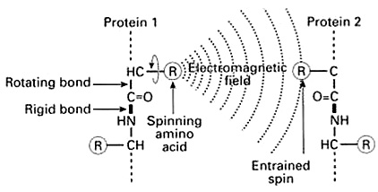 It is now widely accepted that electromagnetic interactions are fundamental to the workings of biological tissues. The drawing below shows this effect diagrammatically, derived from the work of Allen & Cross 1963 and Sauer 1995. Even though the two protein molecules are not in direct contact, the oscillating electric component of the electromagnetic field (termed biophotons) causes the amino acid of protein 2 to oscillate in sympathy with the corresponding amino acid in protein 1. However, the important point to remember is that all electromagnetism is created as a direct result of sound collisions. Sound is always the precursor to electromagnetism.