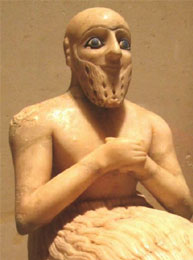 The Sumerians worshipped An as the full time god, equivalent to “heaven”—indeed, the word “an” in Sumerian means “sky.” His consort Ki, means “Earth”. Collectively the gods were known as Anunna ((d)an-unna = “offspring of the lord”). An’s closest cohorts were Enki in the south at the E’abzu temple in Eridu, Enlil in the north at the E’kur temple of Nippur, and Inanna, the deification of Venus, the morning (eastern) and evening (western) star, at the E’anna temple (shared with An) at Uruk. The sun-god Utu was worshipped at Sippar, the moon god Nanna, was worshipped at Ur. These deities were probably the original matrix; there were hundreds of minor deities. The Sumerian gods (Sumerian dingir, plural dingir-dingir or dingir-re-ne) thus had associations with different cities, and their religious importance often waxed and waned with those cities’ political power. The gods were said to have created human beings from clay for the purpose of serving them. If the temples/gods ruled each city it was for their mutual survival and benefit—the temples organized the mass labor projects needed for irrigation agriculture. Citizens had a labor duty to the temple which they were allowed to avoid by a payment of silver only towards the end of the third millennium. The temple-centered farming communities of Sumer had a social stability that enabled them to survive for four millennia.